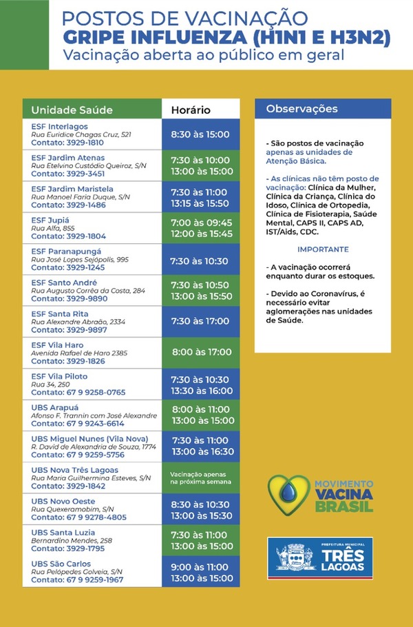 O Setor de Imunização da Secretaria Municipal de Saúde (SMAS) adverte que a Unidade do bairro Vila Alegre continua em obras, e os moradores devem procurar outro postinho de saúde. A vacinação na UBS Nova Três Lagoas não estará funcionando nesta semana.