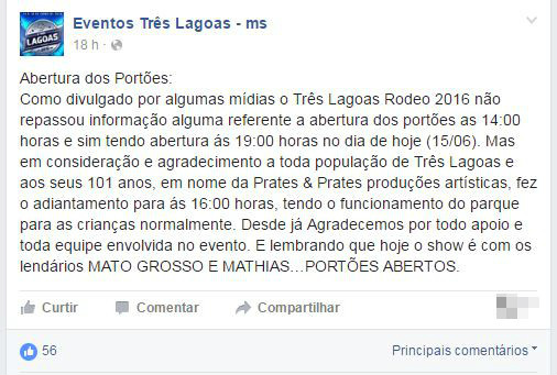 A veiculação de uma notícia falsa em um portal de noticias local causou transtornos aos três-lagoenses, que acreditando que os portões do parque de exposições seriam abertos a partir das 14h nesta quarta-feira (15), se concentraram em frente ao recinto e lá aguardaram por mais de duas horas.