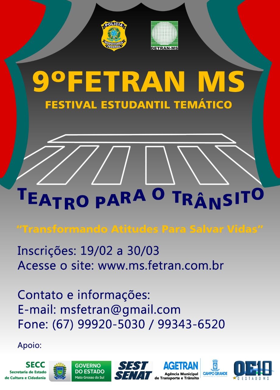 Os professores das escolas municipais de Três Lagoas já podem se inscrever para a 9ª edição do FETRAN MS – Festival Estudantil Temático – Teatro para o Trânsito, em todo o Estado de Mato Grosso do Sul. O concurso anual objetiva despertar a responsabilidade para o trânsito nas escolas, incentivando o desenvolvimento para a arte cênica.