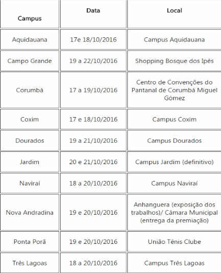 Além das feiras em Aquidauana (Feciaq), Campo Grande (Fecintec), Corumbá (Fecipan), Coxim (Fecitecx), Nova Andradina (Fecinova), Ponta Porã (Fecifron) e Três Lagoas (Fecitel), pela primeira vez serão realizadas a Feira de Ciência e Tecnologia da Grande Dourados (Fecigran), a Feira de Ciência e Tecnologia da Região Sudoeste em Jardim (Fecioeste) e a Feira de Ciência e Tecnologia de Naviraí (Fecinavi). Os campi foram implantados recentemente nesses municípios.