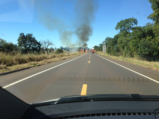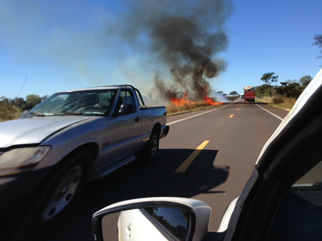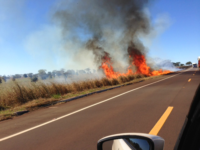O capim seco às margens da rodovia pega fogo facilmente e os ventos fortes ajudam a espalhar as chamas, que causa riscos de acidentes nas rodovias, devido a grande fumaça que tampa grande parte da pista.