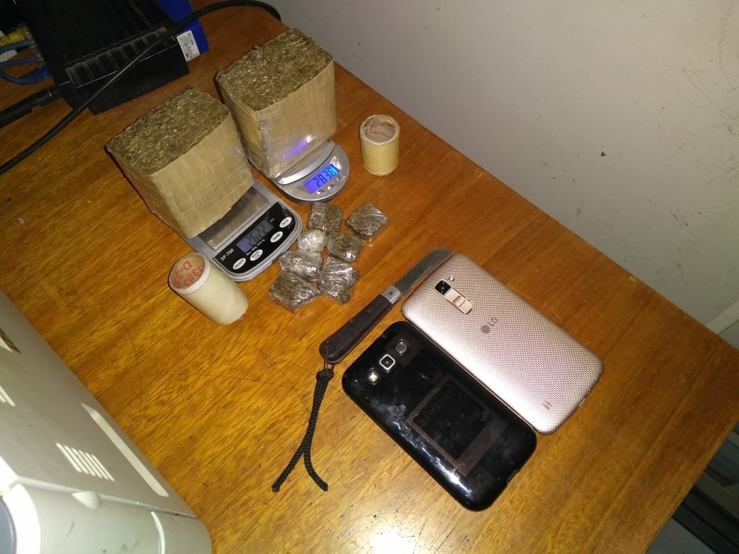 Nas proximidades do muro, os policiais encontraram indícios de terra revirada e quando cavaram o local encontraram cinco porções de maconha pronta para serem vendidas e dois tabletes do mesmo entorpecente.
