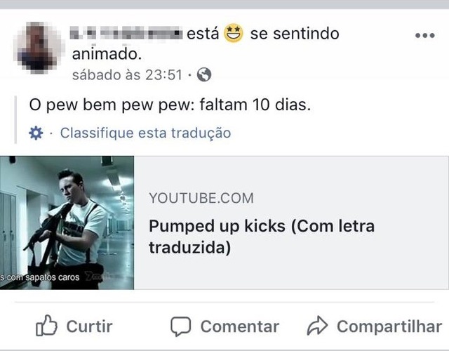 Após realizar diversas ameaças à ex-namorada, o jovem postou a letra de uma música em seu Facebook no dia 22 de Março, com a legenda “10 days left” (faltam 10 dias, em inglês). A letra da música “Pumped Up Kicks”, remete aos massacres nos EUA, um deles, quando dois jovens com tendência homicida entraram em um instituto em Columbine, em 1999, mataram e feriram vários alunos.