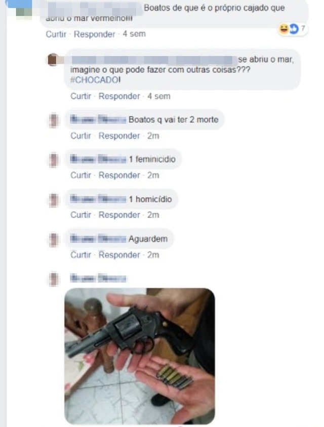 Também na mesma rede social, alguns dias depois, o jovem comentou em uma publicação que haveria um feminicídio (provavelmente da ex-namorada), um homicídio e ainda postou imagem de um revólver com munição. As publicações foram compartilhadas nas redes sociais pedindo para que os alunos da instituição tomassem cuidado.