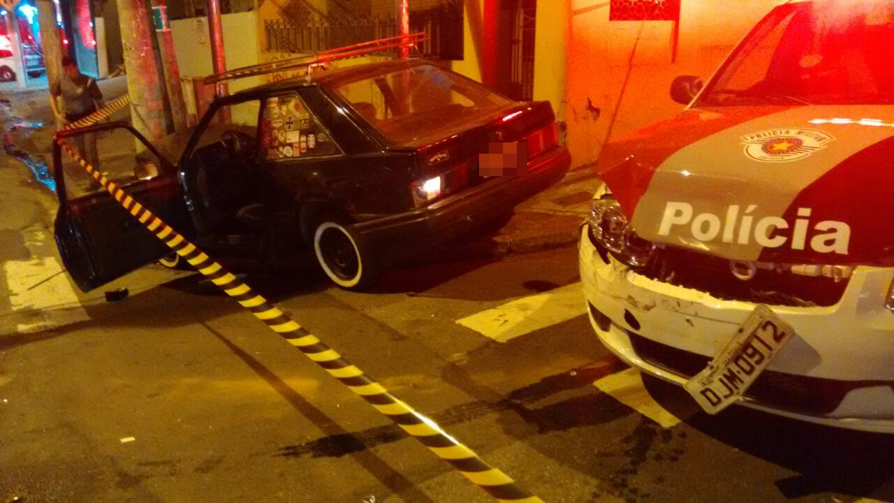 O carro da polícia, que fazia a perseguição, acabou batendo na traseira do automóvel.