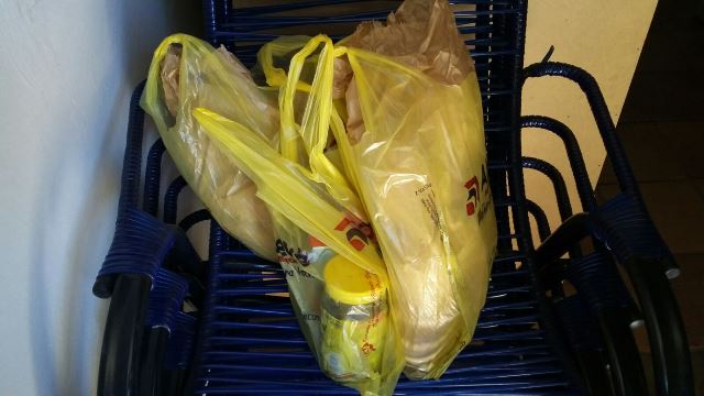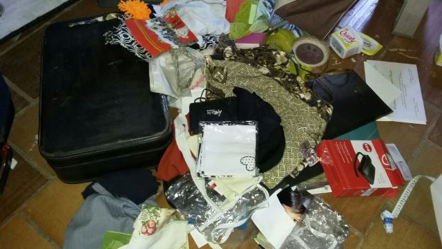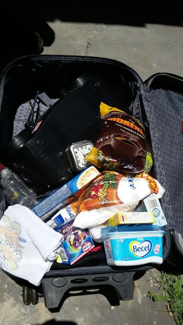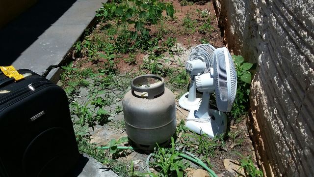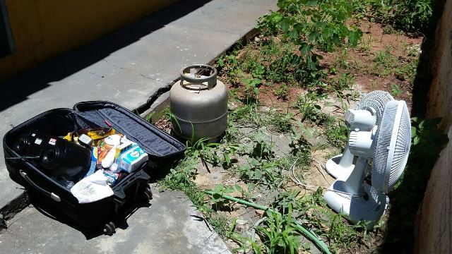 Abandonado na porta da casa, os policiais encontraram dois ventiladores, um botijão de gás, um aparelho de som e uma bolsa de viagem, que foi utilizada para carregar alguns produtos alimentícios.