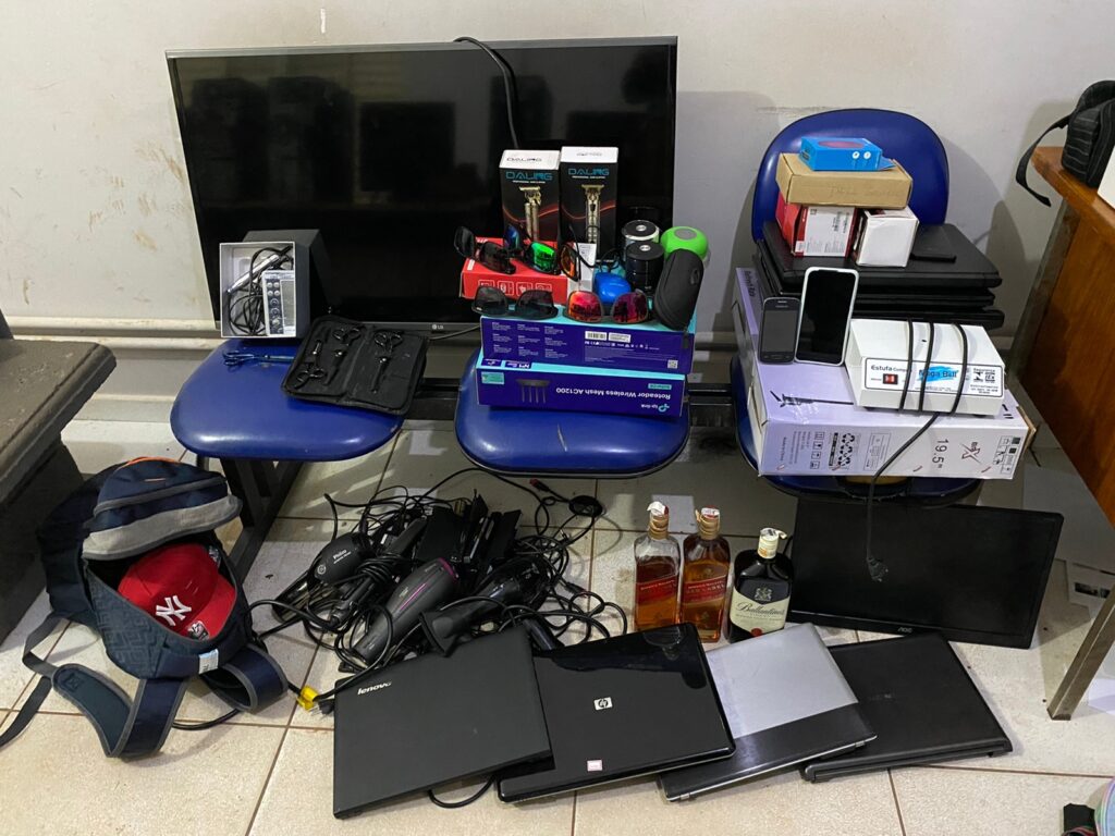 O evadido do sistema criminal relatou que a maioria dos bens furtados estava no interior da residência, levando a equipe ao quarto do casal onde estava todo o material do crime – vários notebooks, uma TV, monitores de computador, celulares e diversos produtos, além de 3 chaves “michas” que eram usadas para abrir as trancas dos estabelecimentos.