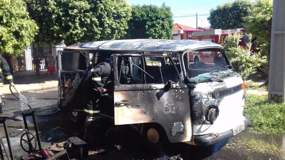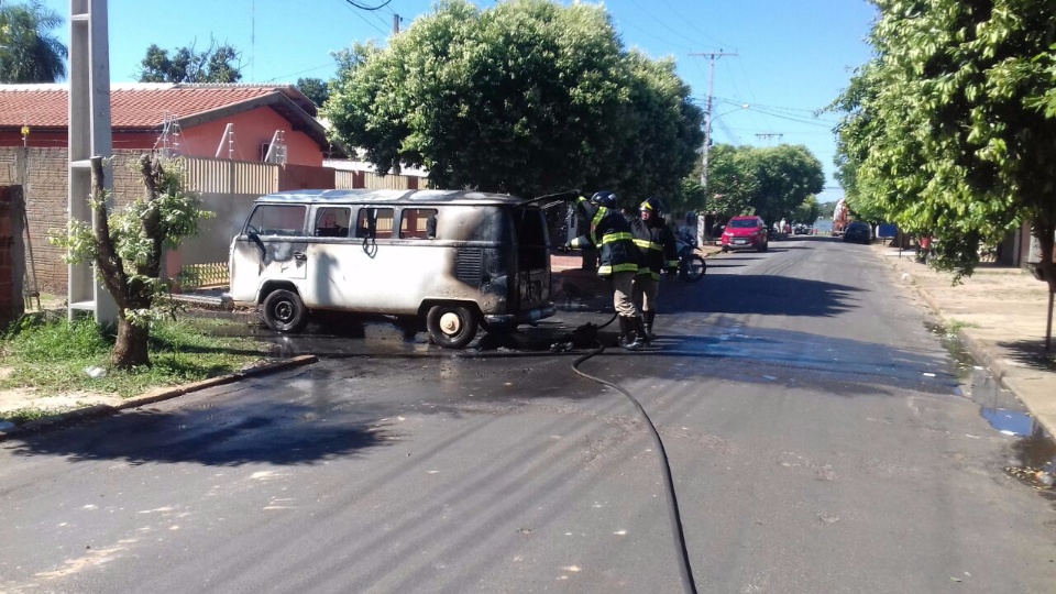 Uma Perua Kombi pegou fogo, na manhã de hoje (14), enquanto estava estacionada na rua José Goulart Correa, no bairro Interlagos, em Três Lagoas.