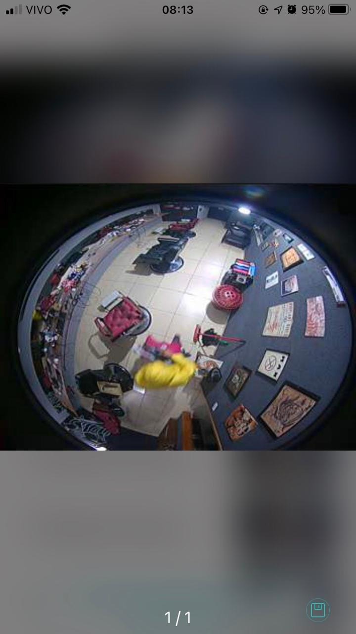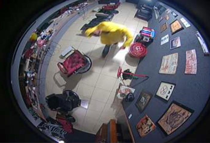 O larápio usou uma blusa de frio amarela com capuz para dificultar sua identificação nas gravações das câmeras de segurança.