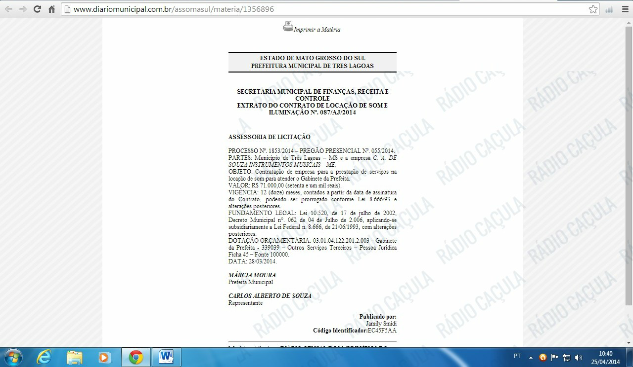 Conforme publicação no Diário Oficial dos Municípios de Mato Grosso do Sul nesta quinta-feira (24), edição 1077, a Empresa C. A. DE SOUZA INSTRUMENTOS MUSICAIS – ME foi contratada pelo Governo Municipal em um prazo de 12 meses para prestar serviços de som ao gabinete da prefeita de Três Lagoas, Márcia Moura (PMDB).