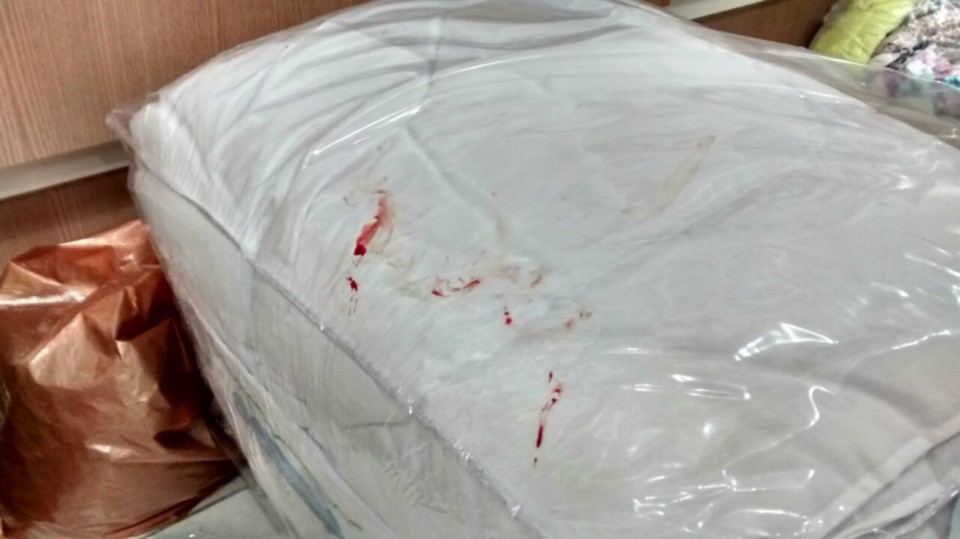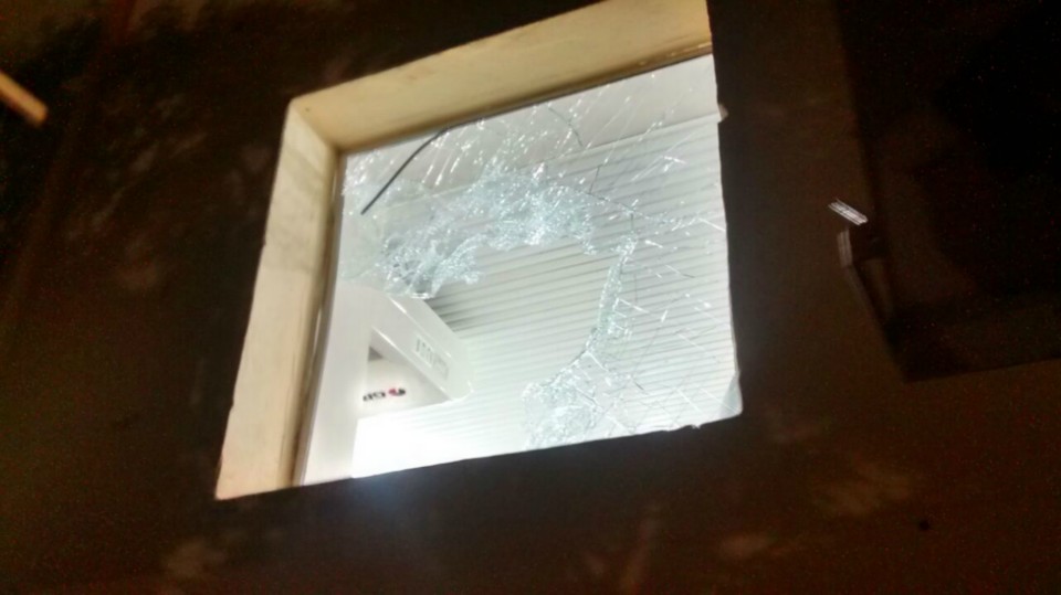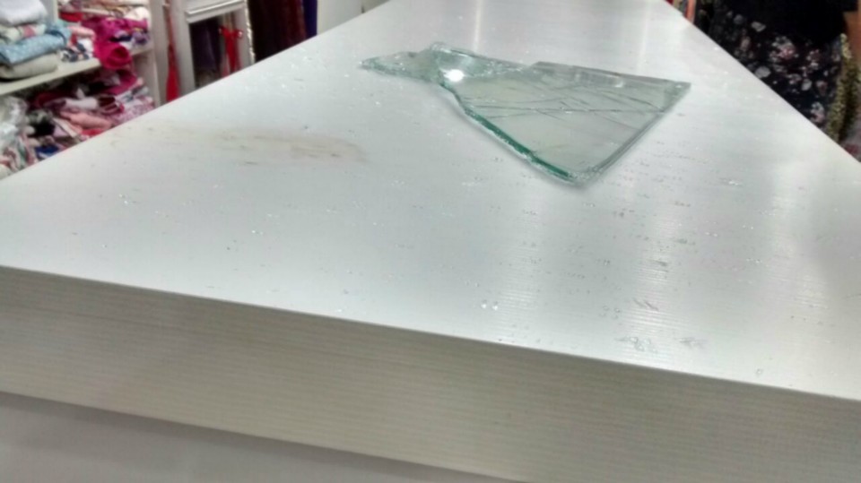 Foram encontradas manchas de sangue no balcão e em algumas mercadorias, o vidro quebrado da janela cortou a pele dele no momento da ação criminosa.