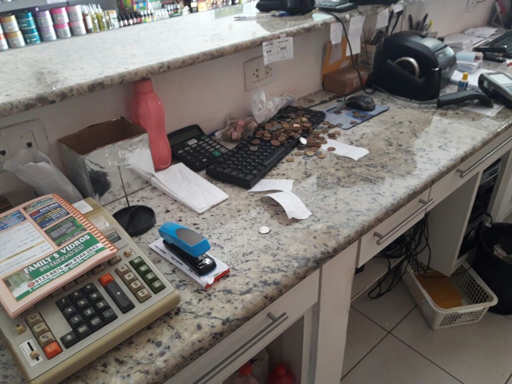 Segundo o proprietário da loja, a porta de vidro foi quebrada e dois homens invadiram o local, furtando kits de higiene pessoal e moedas que estavam no caixa. A polícia ainda não identificou os autores do crime.