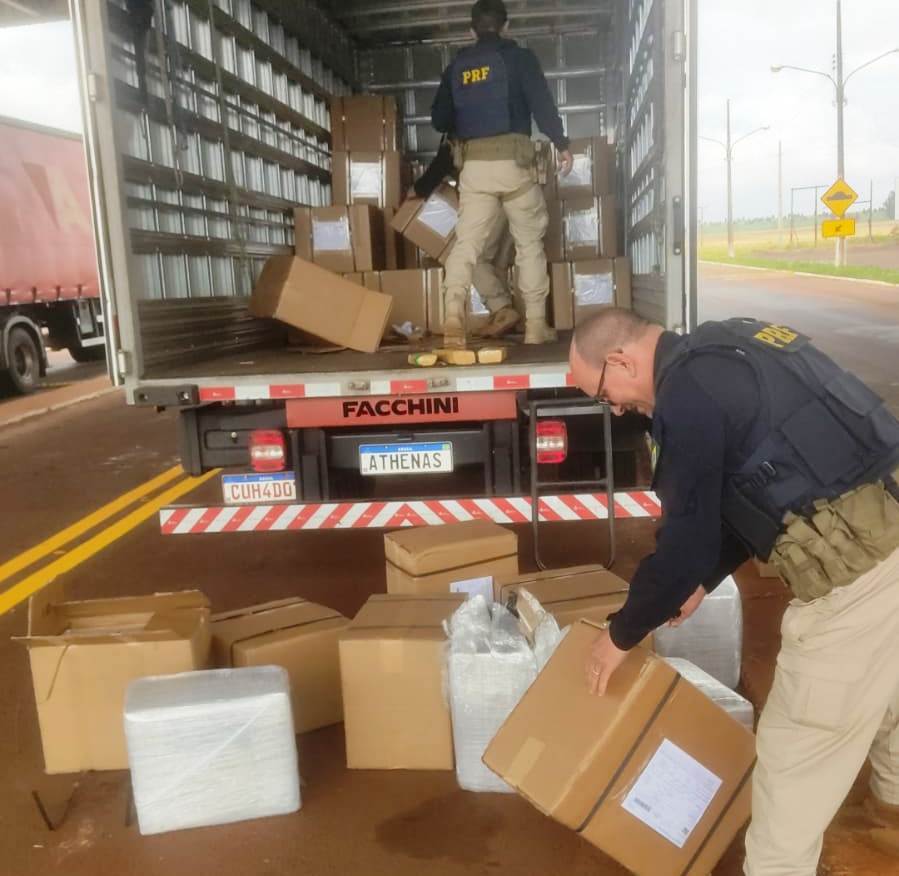 Caminhão-baú levando quase 2,5 toneladas de maconha e munições foi interceptado por policiais rodoviários federais na manhã desta terça-feira (6) na BR-463, no município de Ponta Porã, fronteira com o Paraguai. Entre a carga, os PRFs encontraram um aparelho de GPS, usado pelos traficantes para rastrear a carga via satélite.
