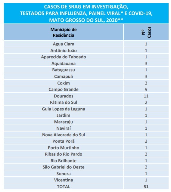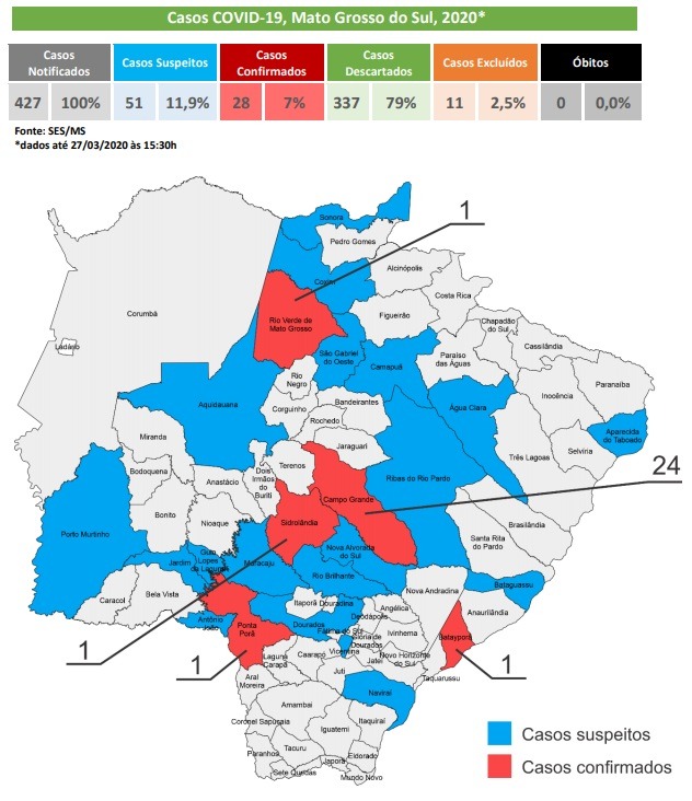 Campo Grande está com nove casos suspeitos. As cidades de Aquidauana, Camapuã, Coxim e Ponta Porã têm três casos cada. Fátima do Sul, Ribas do Rio Pardo e São Gabriel do Oeste têm duas pessoas em observação cada.
