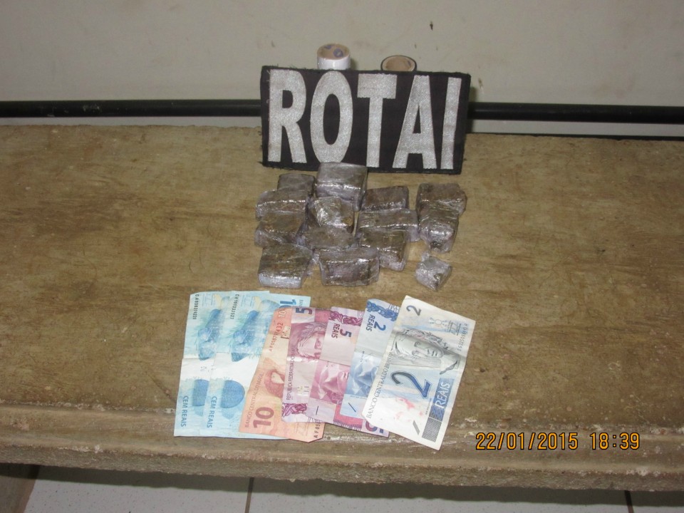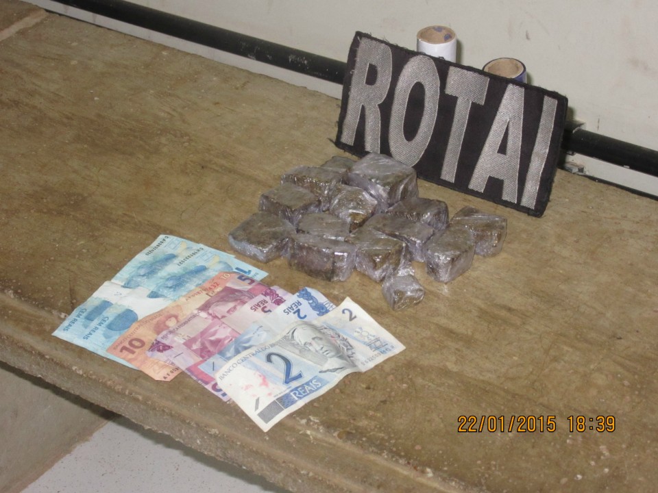 Jovem comercializava drogas em sua residência, onde a ROTAI e a Agência Local de Investigação (A.L.I./P2) de Três lagoas apreenderam 14 tabletes de maconha e R$ 224,00