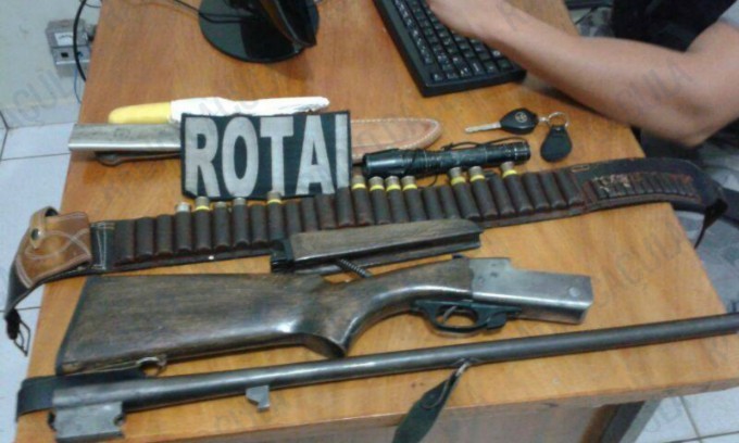 Com eles, a polícia encontrou uma espingarda desmontada de calibre 20, além de doze cartuchos do mesmo calibre, sendo oito intactos e quatro deflagrados.