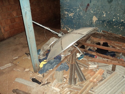 A polícia ao chegar ao local constatou que o acusado proferia palavras de baixo calão contra sua esposa e ainda na posse de uma viga de construção ele destruiu grande parte do muro da residência do casal e uma antena parabólica também ficou completamente destruída na casa.