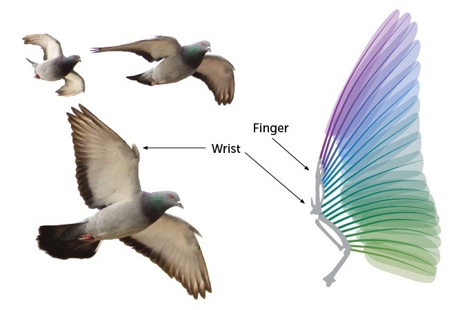 Efetivamente, eles perceberam, os pombos controlam seu vôo usando os dedos e pulsos.