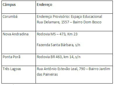 A matrícula deve ser feita no câmpus do IFMS em que o candidato concorreu à vaga. Os endereços estão disponíveis na tabela abaixo.