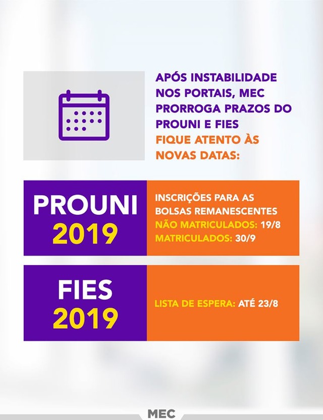 (BRASIL) – O Ministério da Educação (MEC) prorrogou na quarta-feira (14) o prazo das inscrições das etapas em andamento do Programa Universidade para Todos (Prouni) e do Fundo de Financiamento Estudantil (Fies).