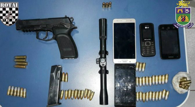 Indagado sobre a procedência das munições o condutor relatou que seria do proprietário do veículo. Diante do fato a guarnição foi até a mecânica do suspeito que autorizou a revista no estabelecimento, onde os policiais encontraram mais 45 munições de calibre 9 mm intactas e uma luneta. O autor confessou que possuía uma arma tipo pistola e estaria na sua residência no Bairro Eldorado. O mesmo autorizou a busca pessoal em sua casa onde os policiais encontraram a arma de fogo em cima do guarda roupas e com a numeração suprimida. Ainda foi localizado um carregador na cômoda do quarto contendo mais 12 munições intactas, mais 06 munições calibre 9 mm e 04 munições calibre 38 também intactas. No total foram encontrados 54 munições 9mm.