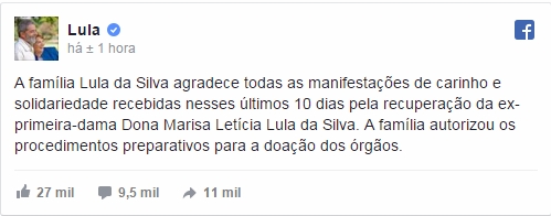 “A família Lula da Silva agradece todas as manifestações de carinho e solidariedade recebidas nesses últimos 10 dias pela recuperação da ex-primeira-dama Dona Marisa Letícia Lula da Silva. A família autorizou os procedimentos preparativos para a doação dos órgãos”.