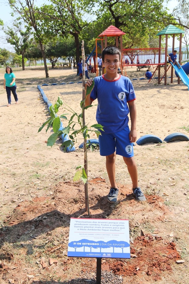 “A árvore produz sombras, frutos e oxigênio. Vamos plantar mais árvores para que o Meio Ambiente fique melhor”, frase vencedora de Nicolas – 13 anos.