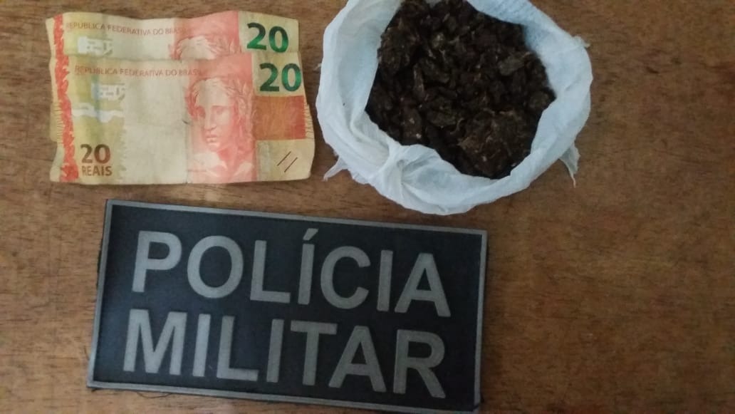 Ao sair do comércio, o garoto foi surpreendido pelos policiais, e ao ser revistado, foi encontrado no bolso de sua blusa um invólucro de plástico contendo maconha, além de duas cédulas de dinheiro somando R$ 40,00.