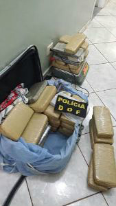 O DOF (Departamento de Operações de Fronteira) fiscalizou um ônibus intermunicipal, com itinerário Paranhos a Eldorado, e encontrou duas malas pretas com 35 tabletes da droga.