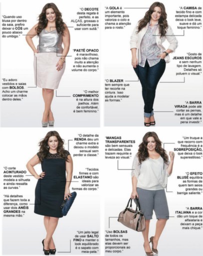 Não é novidade que o padrão de moda atual favorece as mulheres magras. Mas, para as mulheres acima do peso, existem no mercado roupas que valorizam suas formas realçando seus pontos fortes. Afinal todas nós, independente do tipo físico, temos o direito de nos sentirmos bonitas, modernas e admiradas.