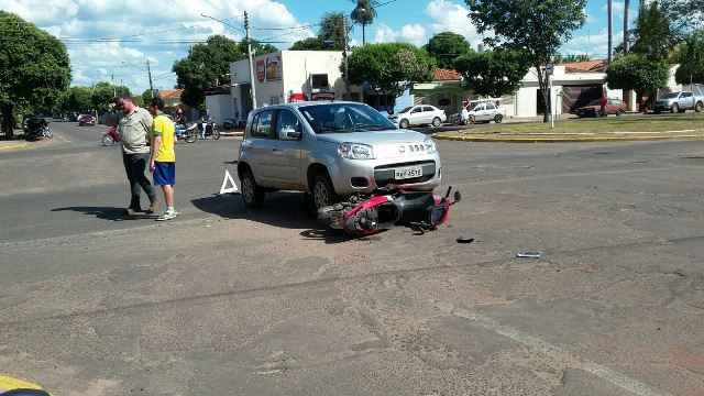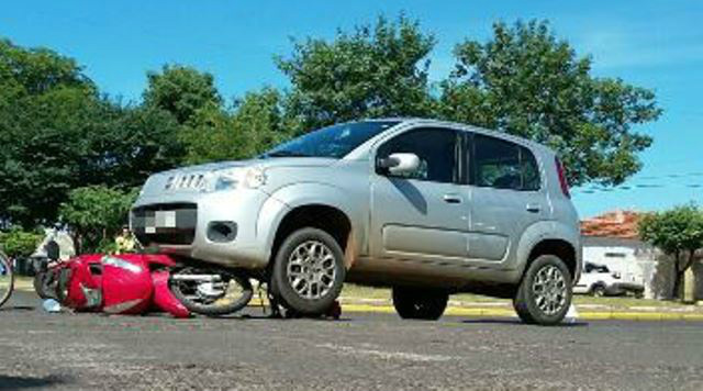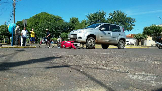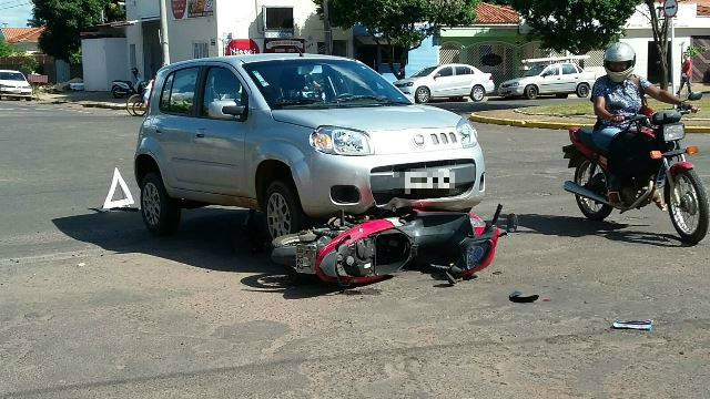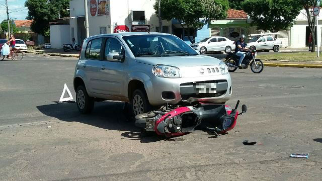 No final da tarde de ontem (22) uma mulher de 27 anos, conduzia sua motocicleta Honda Biz, vermelha, pela Avenida Eloy Chaves, no Bairro Vila Nova em Três Lagoas (MS), sentido bairro ao centro, quando foi atingida por um veículo Fiat Uno, prata, conduzido por um homem de 30 anos, que transitava pela Rua Eurídice Chagas Cruz e invadiu a preferencial.