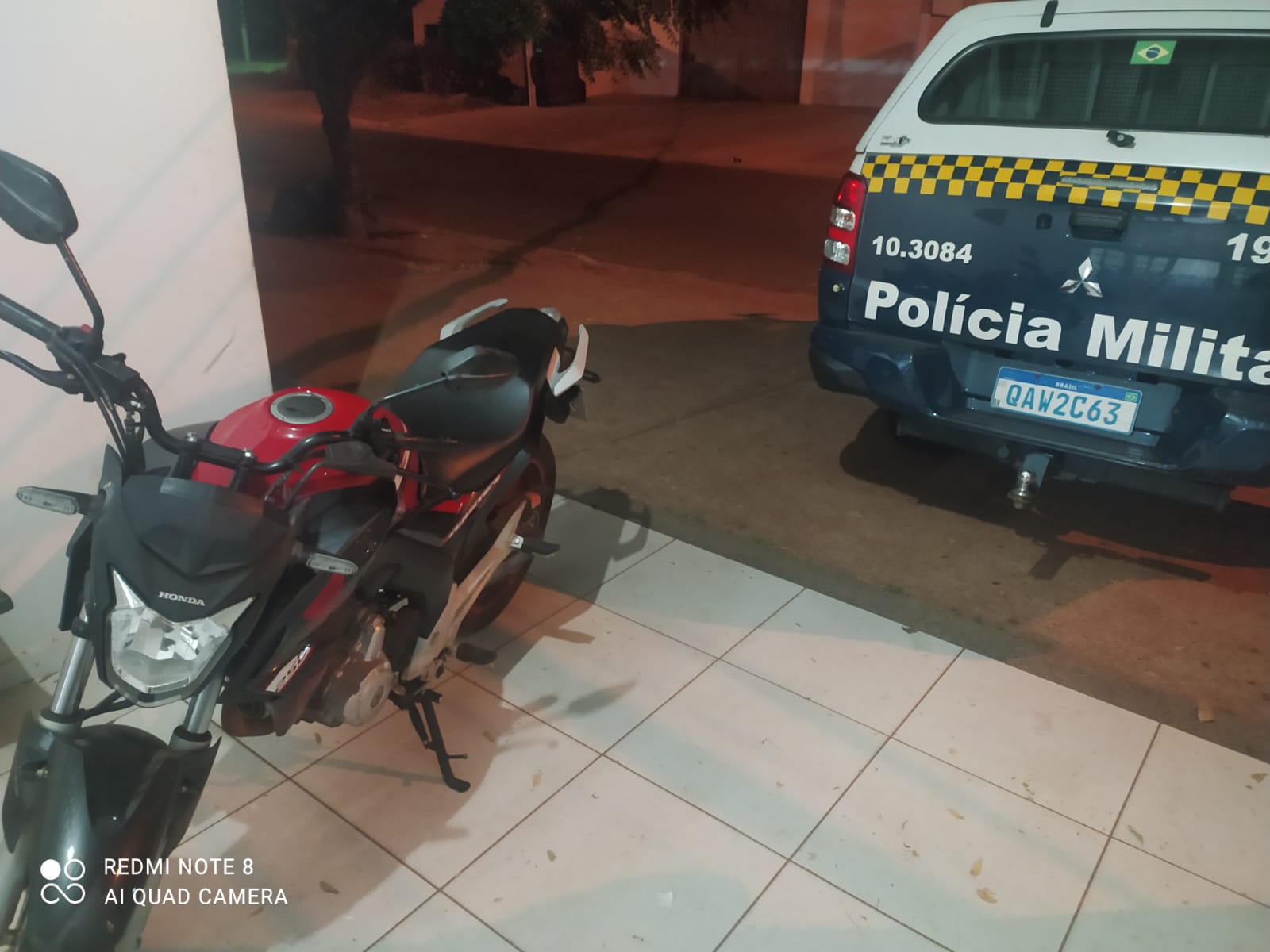 Na vistoria da frente da casa, os militares viram uma moto Honda CB Twister, que não possuía nenhum registro de furto, porém diante da suspeita de ser o veículo que estava sendo procurado, a guarnição entrou em contato com a dona para saber o paradeiro da motocicleta, onde foi informada de que a mesma tinha sido furtada e localizada pela PM.