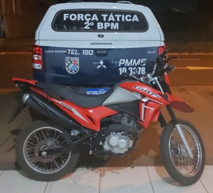 Uma motocicleta foi recuperada pelos policiais da Força Tática de Três Lagoas após denúncias via 190 neste domingo (08). As informações apontavam que um suspeito médio, moreno com tatuagens estaria trafegando sem capacete em uma motocicleta modelo Honda Bros vermelha pelos bairros Vila Haro, Vila Verde e Jardim das Violetas.