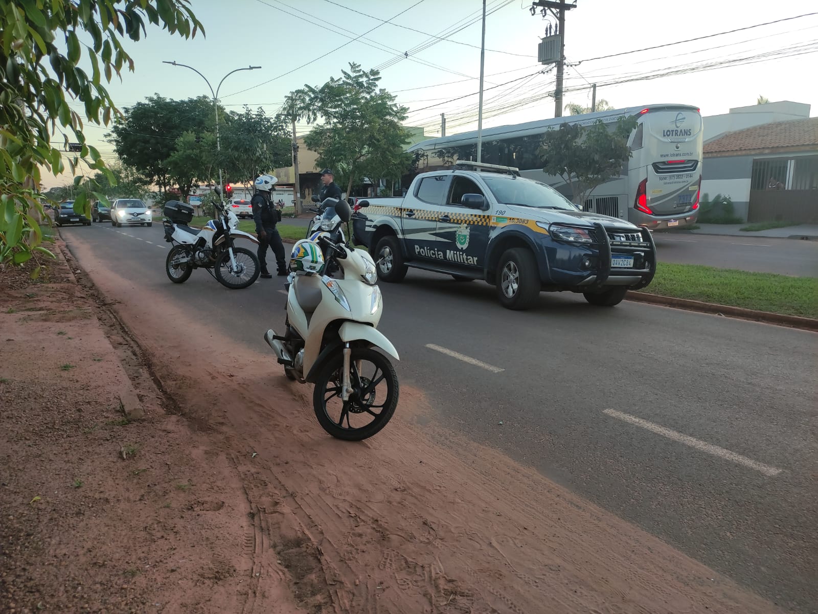 Em patrulhamento pelo bairro Jardim Carandá na tarde deste domingo (30), a equipe do Pelotão de Trânsito avistou uma motocicleta Honda Biz 125, com duas pessoas no veículo que mudaram de direção ao avistarem os policiais, o que motivou a abordagem.