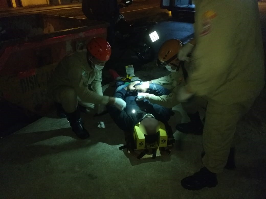 Motociclista que bateu em caçamba é socorrido pelo Corpo de Bombeiros