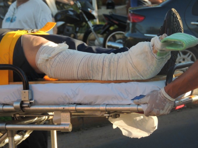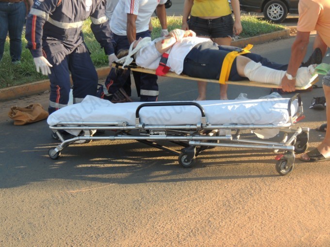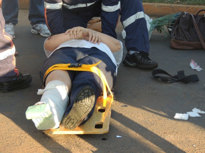 A motociclista foi lançada ao solo e acabou sofrendo uma fratura exposta na perna direita, aparentemente ela tinha acabado de sair do trabalho.