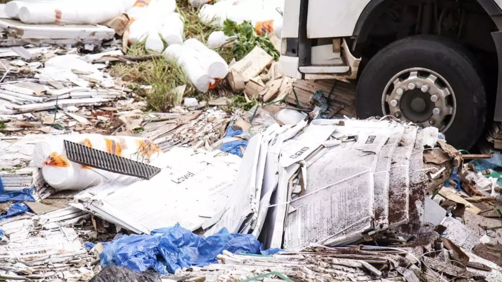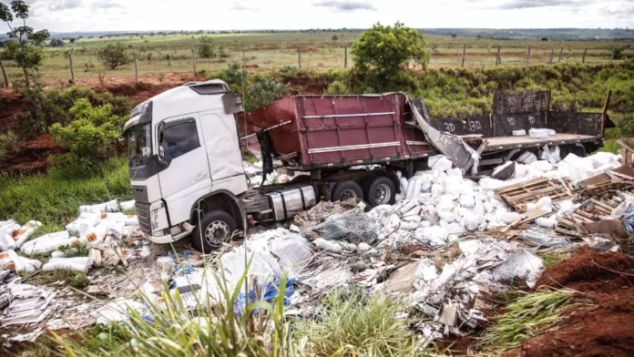 Uma carreta carregada com porcelanato e bandejas de isopor de marmitex tombou às margens de BR-163, próximo ao Condomínio Alphaville, por volta das 20h dessa terça-feira (13). Na manhã desta quarta-feira (14), o caminhão ainda estava no local, aguardando retirada.