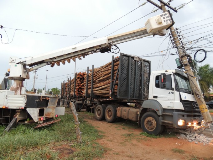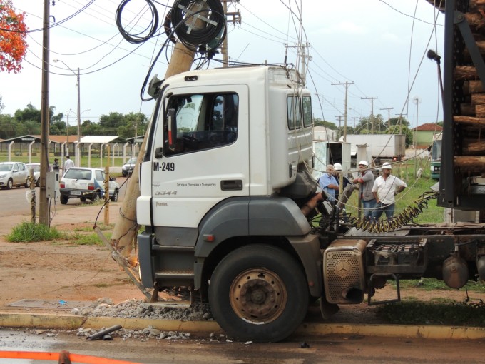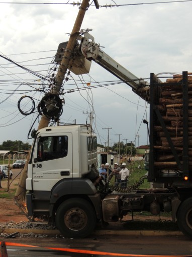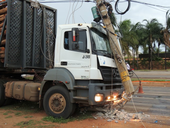 Motorista perde o controle de caminhão e bate em poste de energia