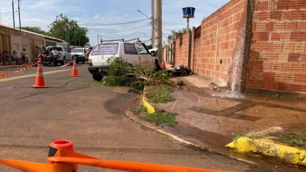 Após jogar carro contra moto em que namorada estava, ele bateu em árvore, cavalete de água e poste de energia