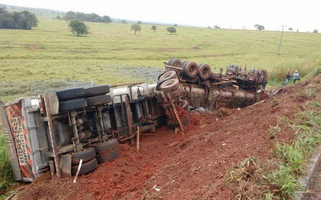 A carreta (CAVALO – TRATOR- V01- VOLVO/FH 540 – 6X4T-PLACA: OOS0574-MS- ATRELADO AOS REBOQUES: OOM3866- OOM3867 E OOM3868 – MS) tombou. Já a camionete (CHEVROLET/S10 LS DD4 – PLACA: MLA1371-SC) ficou totalmente destruída do lado esquerdo.