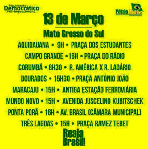Em Três Lagoas, os lideres locais do movimento estão convocando a população a comparecer na praça Ramez Tebet a partir das 15h.
