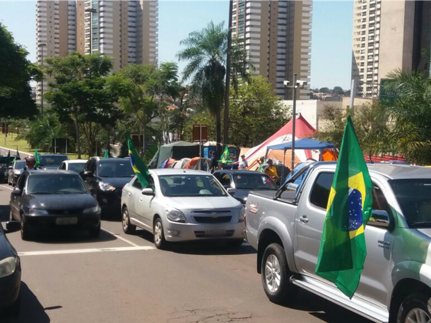 Carretas, carros e motocicletas saíram do Ministério Público Federal (MPF), onde grupos anti governo permanecem acampados, e partiram rumo à Praça do Rádio. Eles usavam bandeiras, cornetas e buzinavam em protesto contra a presidente pelo fim da corrupção.