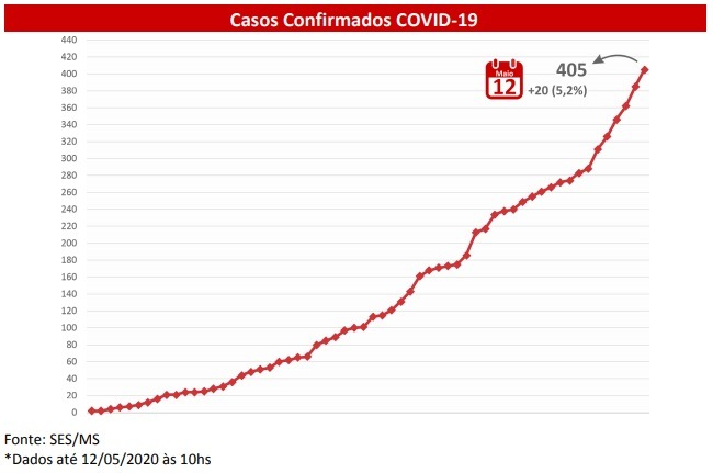 MATO GROSSO DO SUL (MS) – Boletim divulgado pela SES (Secretaria de Estado de Saúde) nesta terça-feira (12), aponta que o Estado totalizou, até 10h desta manhã, 405 casos confirmados – 20 a mais em relação aos dados fechados na segunda-feira (11), com média de 15 casos ao dia. Secretário Estadual de Saúde, Geraldo Resende disse ser preocupante a quantidade de casos novos em 24h que se tem detectado no Estado e ressaltou a importância de ficar em casa sempre que possível.