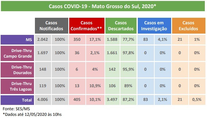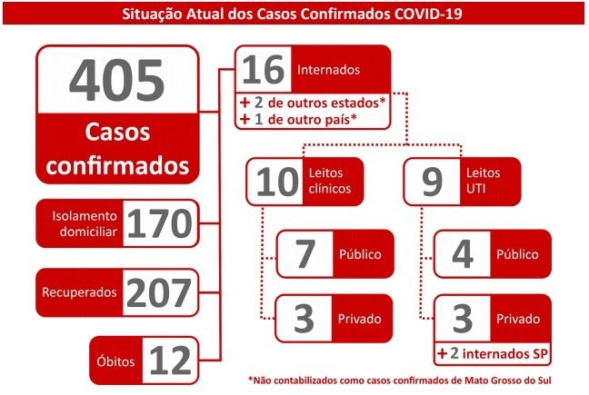 Com surtos em 2 regiões novas, MS registra 4006 casos notificados, dos quais 3497 foram descartados após testagem e 21 excluídos por não apresentarem sintomas do novo coronavírus. Há, além dos 405 casos confirmados, 86 casos sob investigação e 12 mortes.