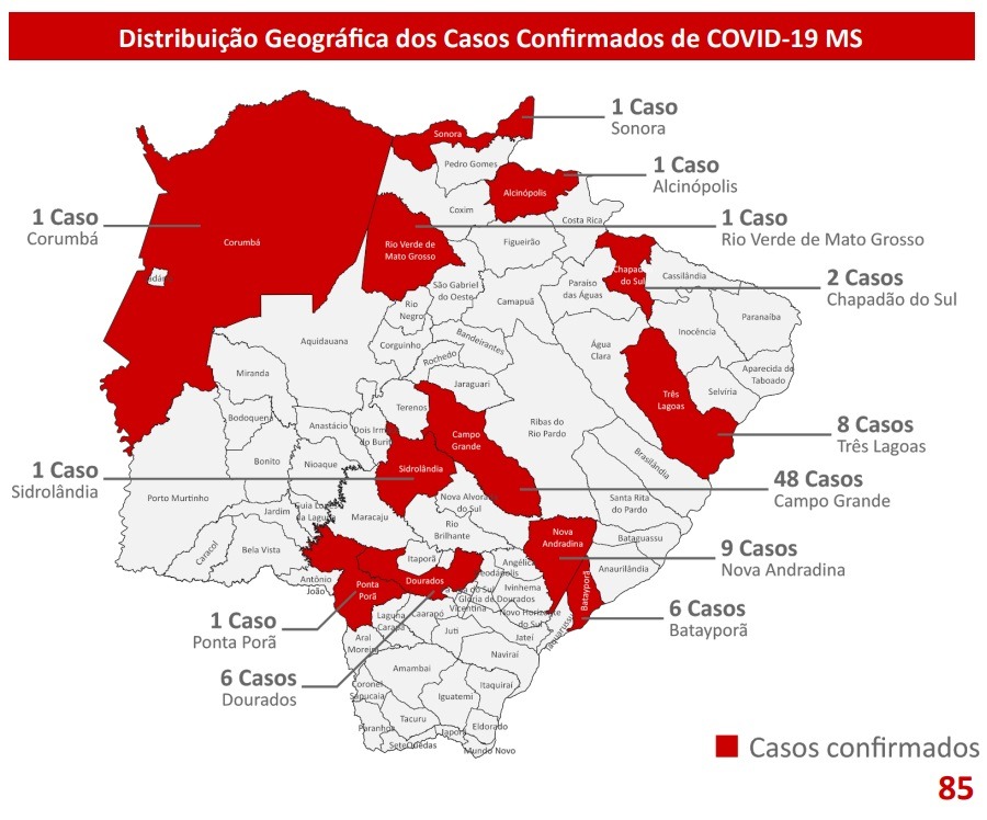 MATO GROSSO DO SUL – O Estado possui mais cinco casos confirmados da Covid-19 e, todos eles de Três Lagoas. São os casos novos registrados em Mato Grosso do Sul conforme boletim divulgado ao vivo pelo Facebook na manhã desta quarta-feira (8). Ao todo, 85 testaram positivo para a doença desde março no Estado.