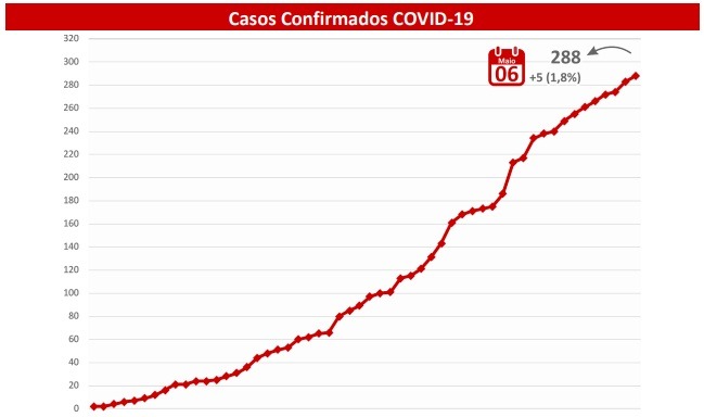 Das 288 pessoas que testaram positivo para o coronavírus, 19 estão internadas (7 em Unidade de Terapia Intensiva), 75 em isolamento domiciliar e 184 se recuperaram. A covid-19 matou dez pessoas no Estado, perfazendo taxa de letalidade de 3,5%.