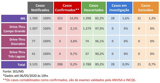 MATO GROSSO DO SUL (MS) – O Estado registrou mais cinco confirmações do novo coronavírus e totaliza 288 casos. Os pacientes com testes positivos têm idade de 1 a 58 anos, sendo moradores em Campo Grande, Três Lagoas, Brasilândia, Dourados e Ladário. Quatro foram infectados ao ter contato com quem já estava com a Covid-19 e o quinto está em investigação.