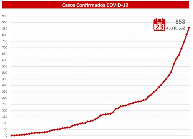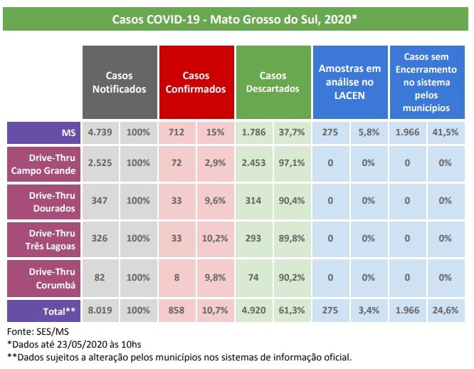 MATO GROSSO DO SUL (MS) – Com mais 53 exames positivos para o novo coronavírus (Covid-19) nas últimas 24 horas, o número de casos confirmados da doença no Estado chega a 858. As informações foram apresentadas neste sábado (23.05) em coletiva de imprensa online nas redes sociais do Governo do Estado.