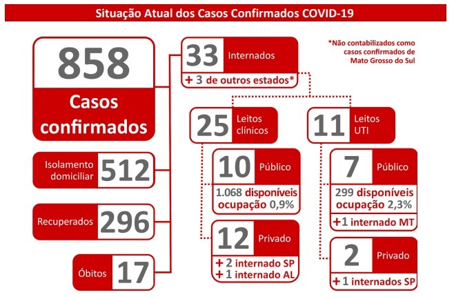 Dos 858 casos confirmados, 512 estão em isolamento domiciliar, 296 estão sem sintomas e já estão recuperados. 36 estão internados, sendo 17 em hospitais públicos e 14 em hospitais privados. Três pacientes internados são procedentes de fora do Estado. Foram registrados 17 óbitos.