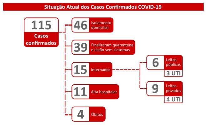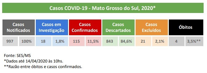 Dos 115 casos confirmados, 46 estão em isolamento domiciliar, 39 finalizaram a quarentena e estão sem sintomas, 15 estão internados, sendo seis em hospitais públicos (3 em UTI) e 9 em hospitais privados (4 em UTI). 11 pacientes tiveram alta hospitalar e foram registrados quatro óbitos. Os dois novos casos confirmados são duas mulheres de Dourados, uma de 41 anos, notificada no dia 13 de abril e outra de 60 anos, notificada no dia 11 de abril.